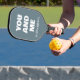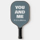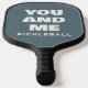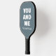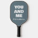 Show some humour playing your game with this You And Me Funny Saying Blue White Pickleball Paddle. It is modern and minimalist designed with a customizable dusty blue background. The humourous phrase is "you and me" followed by the word "pickleball." The typography is bold chunky white.
