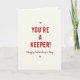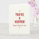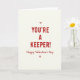 This greeting card delivers a loving message that’s easy to notice and hard to forget. Centered across the front, the words “YOU’RE A KEEPER!” appear in deep red block letters with a slightly textured look, giving them a warm, confident feel ❤️. The background is a soft off-white, which helps the message stand out without feeling harsh. Just above the main text sits a small hand-drawn red heart, adding a gentle touch of affection. Below, the phrase “Happy Valentine’s Day” is written in a smaller red script that feels friendly and sincere, with another small heart tucked underneath. The balanced layout and thoughtful details make this card feel like a sweet reminder worth holding onto. It’s a great choice for a partner or close friend when you want to say they truly matter and belong in your life