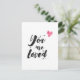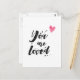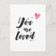 Inspirational postcard displaying the phrase "You Are Loved" in black brush script with an organic ink texture to achieve an authentic, hand lettered look, and a pink heart.