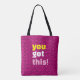 This stylish and inspiring tote bag features a vibrant fuchsia background with an eye-catching black spiral design that adds a sense of dynamic energy. A colourful, pop-art style message in bold, playful letters spells out "You Got This!", offering a daily dose of motivation wherever you go.