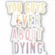 Explore life's mysteries with our 'You Guys Ever Think About Dying?' shirt. This thought-provoking design sparks conversations about existentialism and the human experience. Available in diverse sizes and colours, it offers both comfort and style. Join the philosophical dialogue and make a statement today. Get your shirt and ponder life's deepest questions with us.