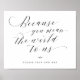 Simple Elegant Calligraphy Script Alternative Guestbook Because you mean the world to us please sign our map - Guest Board Sign in beautiful flowing fancy letters and your personalized text. A stylish yet simple formal design in black and white or any background color you choose. Just click the customize further link, shown under the text personalization area on the right, and choose your custom color background. This sign poster template makes it fast and easy to create stunning additions to your wedding decor. Signs can be enlarged, there are many sizes to choose from, as well as options for custom framing and matting. wedding custom signage.