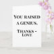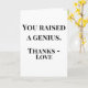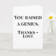 Featuring the phrase "You raised a genius. Thanks - Love" in a clean, stylish typography, this card is perfect for mums who appreciate a laugh without anything over the top. A thoughtful way to say thank you and give credit where it's due.