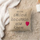 Cool homespun or burlap look, without the scratchy feel! This faux textured pillow features a slightly weathered and aged look. We took just the last few words of the wonderful Shakespeare quote "When I saw you, I fell in love, AND YOU SMILED BECAUSE YOU KNEW". We also added a bright pink heart. The back features the same texture look with just the pink heart. Feel free to use the CUSTOMIZE IT tool to add any text of your own.