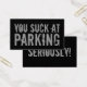 You Suck At Parking Black Business Card. Every time you stuck on parking place, you need to have this great card, because people who aren't polite drivers must know, what other think about them. The truth is always better than a sweet lie.
