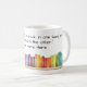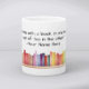 Great gift for any reader. This mug features a shelf of brightly coloured books with a faux "quote" you can personalize. "You'll find me with a book in one hand and a cup of tea in the other." What avid reader and tea drinker wouldn't agree? A mug is a wonderful stocking stuffer. Change the quote and/or the name by using the "Personalize this template Details" link. AI assisted graphic purchased with commercial use. Artwork: MokoDE