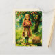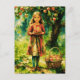 Postcard in a watercolor style portrait of a young girl in a red dress standing in an orchard, holding a basket of apples. Surrounding her are ripe apples on the ground and hanging from trees. The scene evokes warmth, innocence, and the beauty of nature.