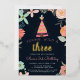 Adorable invitations for your wild one's third birthday feature a boho floral border and pink teepee illustration. "Young, wild and three" appears in gold foil lettering, with your 3rd birthday party details beneath, on a rich navy blue background accented with gold foil trim.