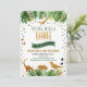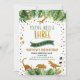 This adorable birthday invitation features tropical watercolor leaves with faux gold foil leaf embellishments, gold dinosaur silhouettes and confetti.