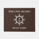 Nautical "Welcome Aboard" boat mat design features a simple, stylish Brown and white coastal style design with boat anchor accent. Personalize the custom text with the name of your boat along with her location city and state.