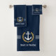Personalize your home with an elegant nautical themed bath towel set displaying your boat name, family name or other desired text. This custom design features a vintage boat anchor, gold style laurel leaves with star emblem and finished off with delicate white stripes on a deep navy blue background. The back of the towel set is white, while you can easily change the front side primary colour to match your current decor or theme.