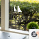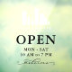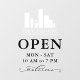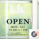 Open hours window clings personalized with your logo above OPEN written in elegant letters, and welcome in a swirly script. Add your opening hours. A clean, minimalist look.