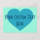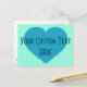 This postcard features a shapely turquoise heart on a light green background overlaid by a text template. Click "Customize it!" to re-size/re-position turquoise heart image, change background colour, and personalize text. Choose font, style, size, and colour. The reverse side of the card is blank, awaiting your personalized text or handwritten sentiments.