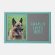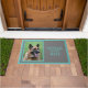 You can personalize this doormat by adding your dog's (or cat's) photo. Your pet's name can be added next to the photo. Both name and words can be personalised. The background is grey.