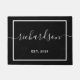 This simple and stylish doormat features your last name in trendy white handwritten script, along with the year your family was established and a modern white geometric frame on a black background.