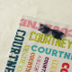 Create a very extremely personalized beach towel. Your custom name appears all over this towel in a collage of different fonts and lettering styles. Lettering in red, yellow, orange, lime green, turquoise, pink and purple is set against a light tan or cream coloured background.