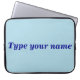 Light blue laptop sleeve that you can personalize by typing your name. You can also change the font style, font color and the laptop sleeve color in the design tool. Please check the appearance after typing your name. If the appearance is pleasing to you, you can place your order now. If you need to resize or reposition your name, please adjust in the design tool.