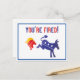 A design featuring the democratic animal kicking away a Republican Elephant Trump.