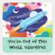 You're out of this world, valentine. Fun outer space spaceship is a great valentine for boys at school or classroom. Blue and colourful heart background with rocket ship flying through the night sky.