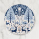 A beautiful illustration of a woodland scene with deer, trees, and animals in a blue colour palette, Scandinavian-inspired artwork, detailed foliage patterns, traditional Nordic motifs, and a rustic wooden house visible in the background. A decorative border forms around all the elements. The design includes features such as deer antlers, wildflowers, leaves, fireflies, stars, and animal footprints. A beautiful design for all your Christmas festivities!