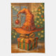 Bring a little holiday enchantment to your kitchen with this magical towel. A crooked orange witch hat—complete with a shiny red ornament hanging from its tip—rests playfully atop a festive gift box wrapped in green and orange ribbons. Soft golden lights, a glowing Christmas tree, and a snowy windowsill create a cozy winter atmosphere full of charm and seasonal magic.