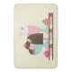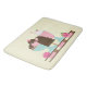 A bathmat with a sweet ice cream theme. Illustrated with a chocolate ice cream bar, 3-scoop sundae with a cherry on top, and a strawberry float with whipped cream. Little strawberries and cherries. Pale yellow background. Refreshing, hot summer treats.
