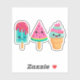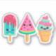 Contour sticker with an illustration of 3 different ice cream treats. A blue-green popsicle with strawberry drippings and colourful sprinkles. A watermelon popsicle. A cone with layers of delicious ice cream in pink and mint. All with cute kawaii smiles.