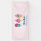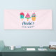 Business banner with an illustration of 3 different ice cream treats. A blue-green popsicle with strawberry drippings and colourful sprinkles. A watermelon popsicle. A cone with layers of delicious ice cream in pink and mint. All with cute kawaii smiles.