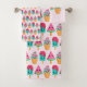 Patterned towel set with an illustration of 3 different ice cream treats. A blue-green popsicle with strawberry drippings and colourful sprinkles. A watermelon popsicle. A cone with layers of delicious ice cream in pink and mint. All with cute kawaii smiles.