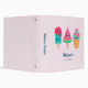 A recipe (or other) binder with an illustration of 3 different ice cream treats. A blue-green popsicle with strawberry drippings and colourful sprinkles. A watermelon popsicle. A cone with layers of delicious ice cream in pink and mint. All with cute kawaii smiles.