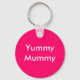 "Yummy Mummy" keychain. White on pink background.