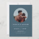 This wedding invitation features a sans serif font duo, modern minimalist design, and round personalized photo with a modern bohemian dusty slate blue colour combination. This wedding invite is perfect for your favourite modern minimalist couple. Easily edit the photo and add your wedding website (and/or QR code onto the backside).