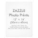 Zazzle Custom 12" × 16" Photo Print Template. Portrait 12" × 16" (30.5 × 40.6cm); 4:3 (1.33); 3600 x 4800 - for B&W paper. Commonly called “30 × 40 cm”. Makes a great personalized birthday, anniversary or Christmas gift, with various additional frame options. Upload your own photo and fully personalize with text (dozens of font style options) and your own image, pattern, motif, or design. MEDIA: Kodak Professional Photo Paper (Satin). Developed specifically for darkroom printing, Kodak photographic paper is a premium silver-halide paper designed to dramatically enhance colours, while maintaining consistent tonal reproduction.