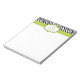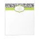 This notepad is all about being a girly girl. Zebra print makes a striking background for an ornate frame on a polka dot lime green ribbon. A name or other message is showcased in the frame surrounded by curly ornaments. Available in alternate colours with matching products.