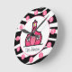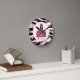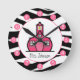 Une horloge avec un design imprimé zèbre et le logo de The Pink Schoolhouse. Personnalisez avec votre nom sous la maison de classe. L'horloge comporte des nombres blancs sur des points roses.
