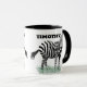 This coffee mug features a realistic style illustration of a black and white zebra standing in some green grass. This zebra has matching green eyes. This mug is ready to be personalized with a name in bold black letters. The name and graphic appear on both sides of this mug.