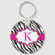 This keychain is all about being a girly girl. Zebra print makes a striking background for an ornate frame on a polka dot fuchsia ribbon. A monogram is showcased in the frame. Available in alternate colours with matching products.
