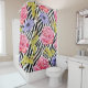 A trendy black and white zebra stripes print with a bold and beautiful pink and purple peony floral pattern.