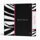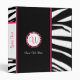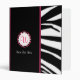 A stylish binder featuring a black main background. Zebra print design on sides of front and back, as well as on top and bottom of spine. Hot pink Trim. Front features design consisting of a circle shaped zebra print frame with pink trim. Add your initial inside frame. Customize text on front, back, and spine.