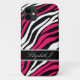 Stylish custom iPhone 5 case personalized with your name, and designed with a zebra print pattern with black, white, and hot fuchsia pink zebra stripes.