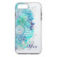 Customized iPhone 7 Case: Lacy Teal And Blue Floral Mandala Pattern/Subtle Cream Background/ Personalized Modern Name Typography