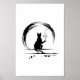 a serene and minimalist masterpiece, embracing the styles of Zen Ink Painting and Minimalism to evoke a sense of tranquility, enlightenment, and meditation. At its core is a black and white drawing of a cat, sitting gracefully on a rock in front of a circular shape with a central hole. The cat's eyes are gently closed, and it gazes upwards, attaining a state of deep contemplation and inner peace. Its tail curls upwards, symbolizing a profound connection with the spiritual realm. The circular shape that frames the cat is a composition of different lines and shapes, including circles, triangles, and curves. These elements collectively convey a sense of harmony, balance, and interconnectedness. The overall design is brilliantly simple and devoid of any additional elements or colors. This minimalistic approach allows the viewer to focus on the essence of the image, which likely represents meditation and spirituality. "Zen Cat's Meditation" invites us to reflect on the beauty of stillness and the serenity that can be found within, transcending the complexity of the world around us.