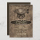 This gorgeous steampunk wedding invitation features a gorgeous zeppelin blimp with cogs and holding a sign where you can write in the bride and groom's names. This invitation is great for weddings or personal events. The background texture is like thick brownish clouds. Makes it great for a steampunk themed occasion.