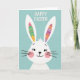 This card shows a friendly, human-like bunny centered on a muted teal background, looking straight out with an inviting, affectionate expression 🐰. Its tall white ears rise upward, and inside each ear sit egg-shaped patterns in pastel green, yellow, orange, and purple with zigzags and stripes that feel like little gifts tucked close. The bunny’s large black eyes with small lashes and its gentle smile suggest the kind of warm attention you’d give a close friend. Soft pink cheeks and thin black whiskers add a tender, bashful touch, as if it’s quietly pleased to be near someone. Across the top, a seasonal greeting appears in bold white sans-serif letters, spaced clearly above the bunny’s head. The teal backdrop has a faint grainy texture that keeps the flat shapes from feeling stark, and the overall palette stays soft and springlike 🌷. The patterned eggs sit neatly within the inner ear shapes, framed by crisp white edges against the teal field.