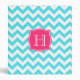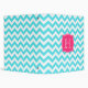 A hot pink custom monogram frame is on a background of white and turquoise zigzags.