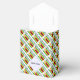 Tent shaped favour box has the Flag of Zimbabwe, or Zimbabwean Flag, with the word ZIMBABWE, underneath. Design is tiled, with a space for your name for personalization or a customized favour box.