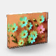 This vibrant botanical study celebrates the Zinnia elegans , rendered in a loose, expressive style that captures both natural beauty and artistic interpretation. Turquoise, buttercup yellow, and soft pink petals radiate from rich brown centres, contrasting boldly against a warm, earthy backdrop of terracotta and burnt sienna. The textured brushstrokes evoke a sense of movement, as if the flowers sway gently in a sunlit garden.