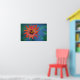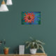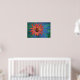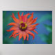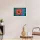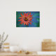 This quality poster features an orangy red zinnia with a striking blue and green background.