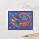 Scorpio, the scorpion, is surrounded by shining stars. Water sign, October 24 - November 22 (there may be a variation in the dates). Postcard with an orange, red, blue and yellow customizable design for you to personalise with your own text, images and ideas. An original coloured pencil and metallic ink drawing by Jess Perry.