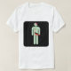 Black semi fitted mens tshirt with an illustrated picture of a traditional bathroom sign for zombies. The picture shows a male icon used on bathroom signs, only he is green with half of his skull missing exposing the brain, bullet holes in the chest, and his abdomen cut open with the guts pouring out. This funny zombie twist on the usual bathroom sign is the perfect tshirt for the stylish alternative zombie loving male with a sense of humour.